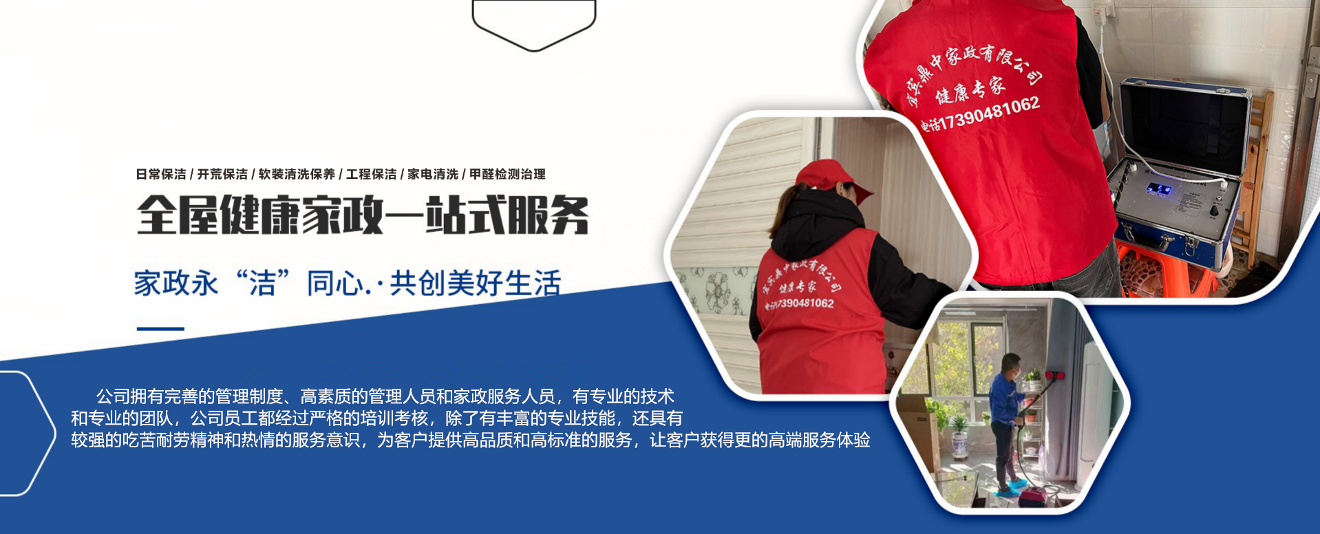 宜賓鼎中家政有限公司,是一家提供家庭健康一站式服務(wù)的新型家政公司,本公司提供,日常保潔,開荒保潔,甲醛檢測和治理,家電清洗,軟裝清洗,拋光打蠟,各種養(yǎng)護(hù),工程服務(wù),大型油煙機(jī)清洗和中央空調(diào)清洗等服務(wù)。 我公司起源于2012年,從當(dāng)時(shí)單打獨(dú)斗的游擊隊(duì),到現(xiàn)在發(fā)展成為一家為家庭提供一站式服務(wù)的新型家政公司,有專業(yè)的技術(shù)工程師和各項(xiàng)服務(wù)的專業(yè)團(tuán)隊(duì),服務(wù)過無數(shù)家庭和事業(yè)單位,比如理工大學(xué)、宜賓學(xué)院開荒保潔,宜賓商業(yè)銀行保潔等。 公司擁有完善的管理制度、高素質(zhì)的管理人員和家政服務(wù)人員,有專業(yè)的技術(shù)和專業(yè)的團(tuán)隊(duì),公司員工都經(jīng)過嚴(yán)格的培訓(xùn)考核,除了有豐富的專業(yè)技能,還具有較強(qiáng)的吃苦耐勞精神和熱情的服務(wù)意識,為客戶提供高品質(zhì)和高標(biāo)準(zhǔn)的服務(wù),讓客戶獲得更******的高端服務(wù)體驗(yàn)。 誠信為本,品質(zhì)至上,服務(wù)于千家萬戶 宜賓鼎中家政有限公司--------竭誠為您服務(wù) 聯(lián)系人:楊總 電話:17390481062(微信同號) 地址:四川省宜賓市敘州區(qū)朱家坡路1號緹香灣